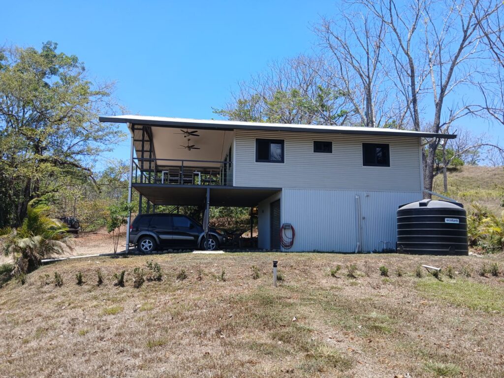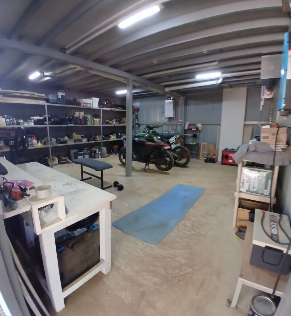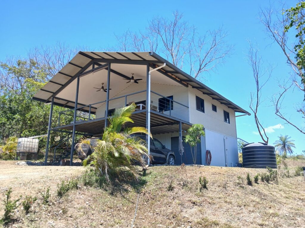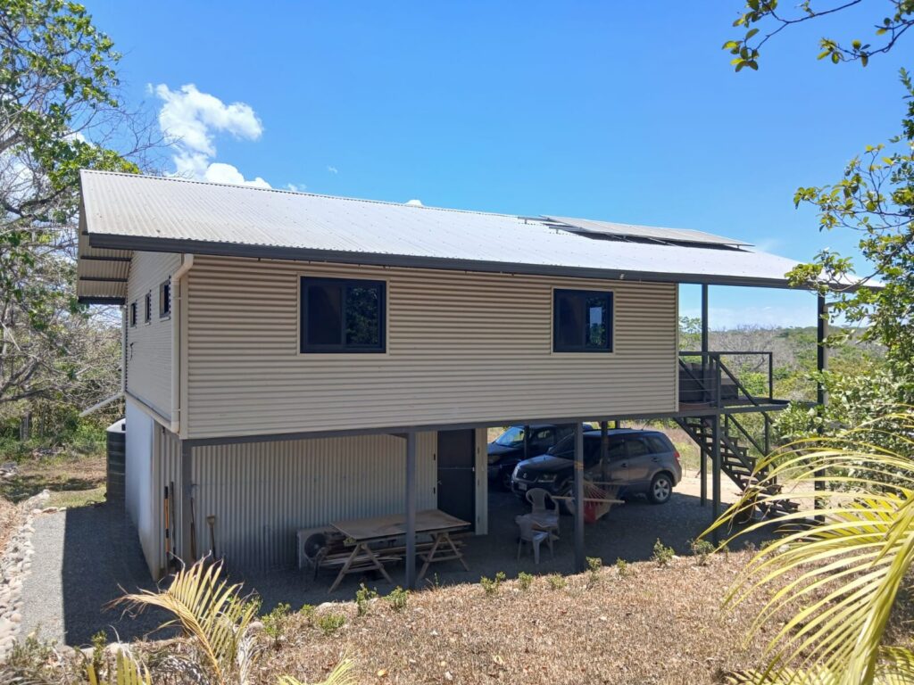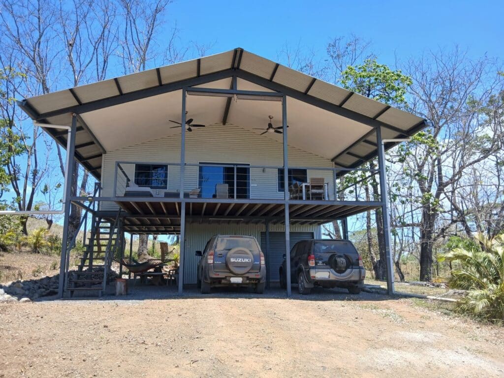 Below, a versatile workshop space offers practical functionality, complemented by covered parking for two vehicles. The home’s metal construction provides durability and ease of maintenance, ideally suited to the tropical environment.