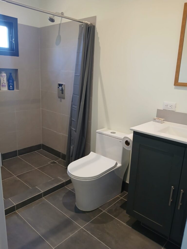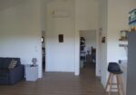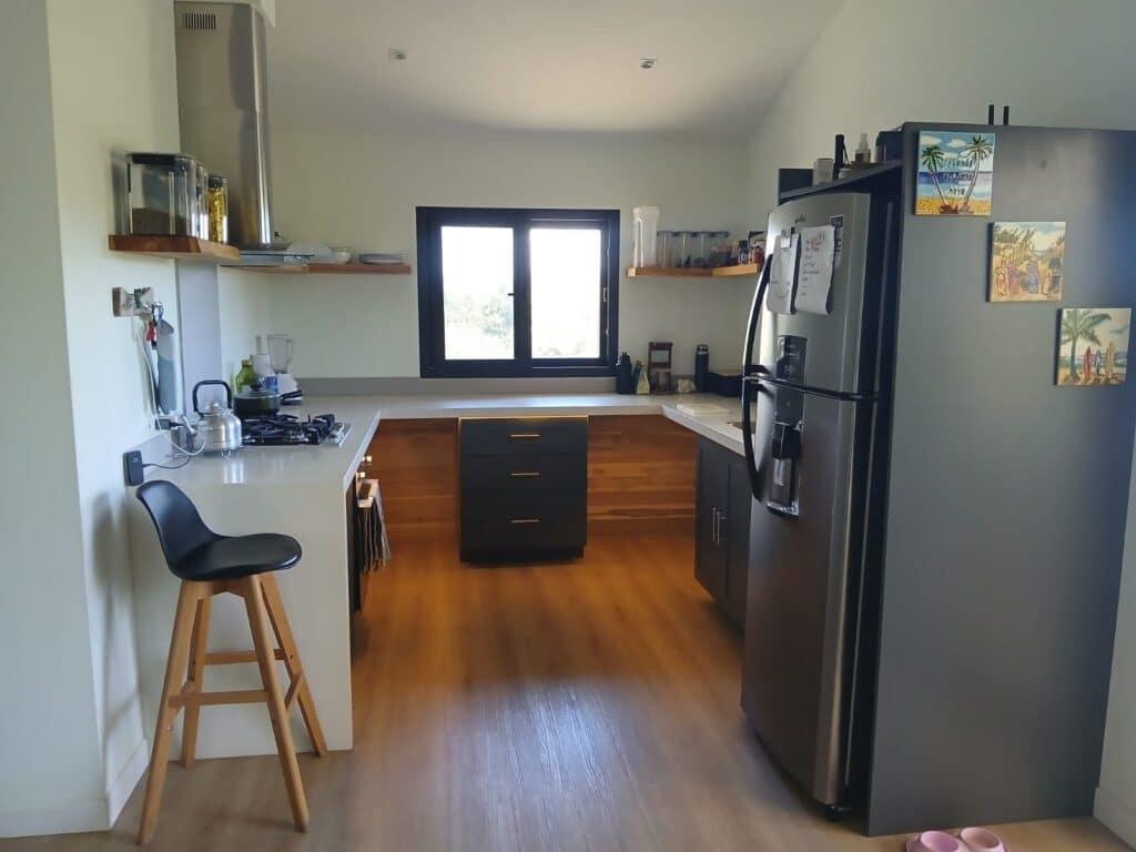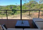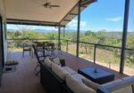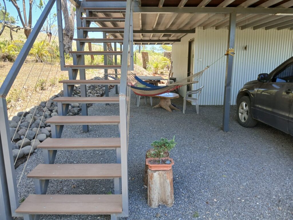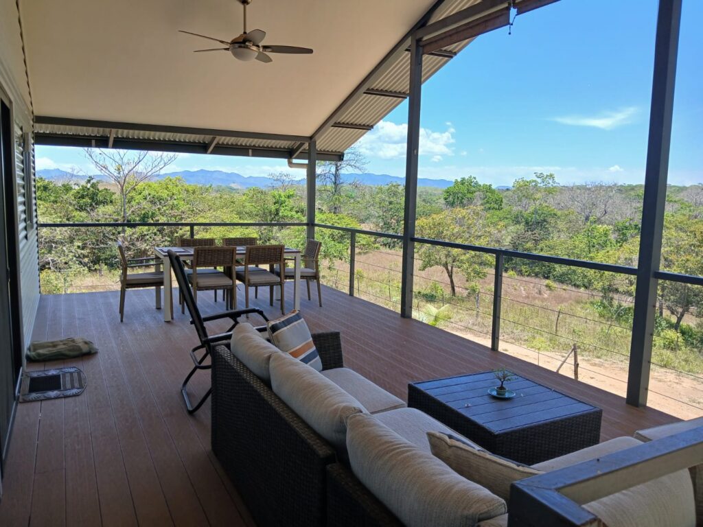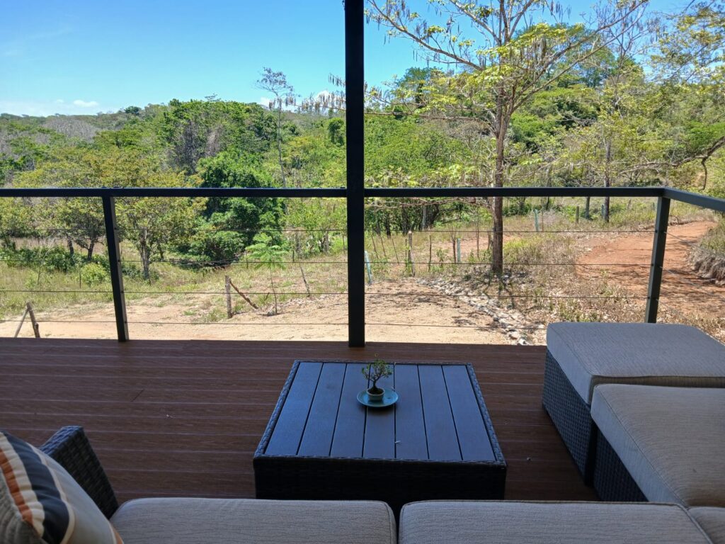 The upper level includes 2 bedrooms and 2 bathrooms (1 en suite), an open living and dining area, and a fully equipped kitchen. Air conditioning in the living room ensures comfort, while a generous covered terrace extends the living area outdoors, capturing expansive views across the valley and the rolling mountains of Cóbano.
