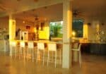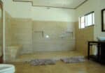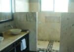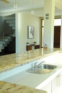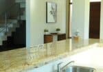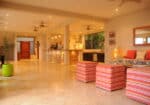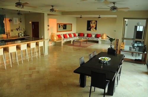 The interiors feature coralina stone floors that extend seamlessly onto the terraces, creating a natural flow between the indoor and outdoor living areas. A large, fully equipped kitchen with granite countertops opens to the dining area and lounge, where guests can gather, dine, or simply relax to the sound of the ocean.