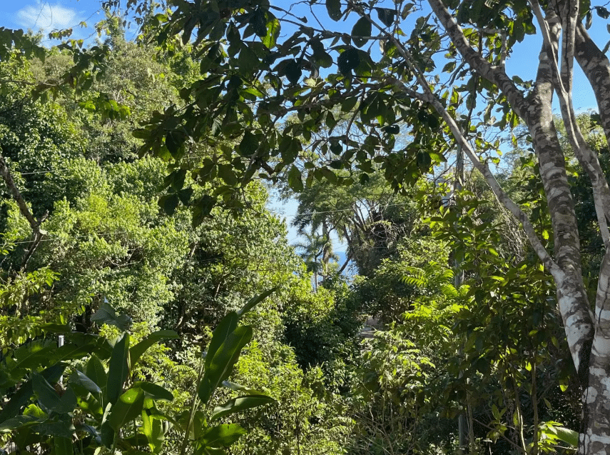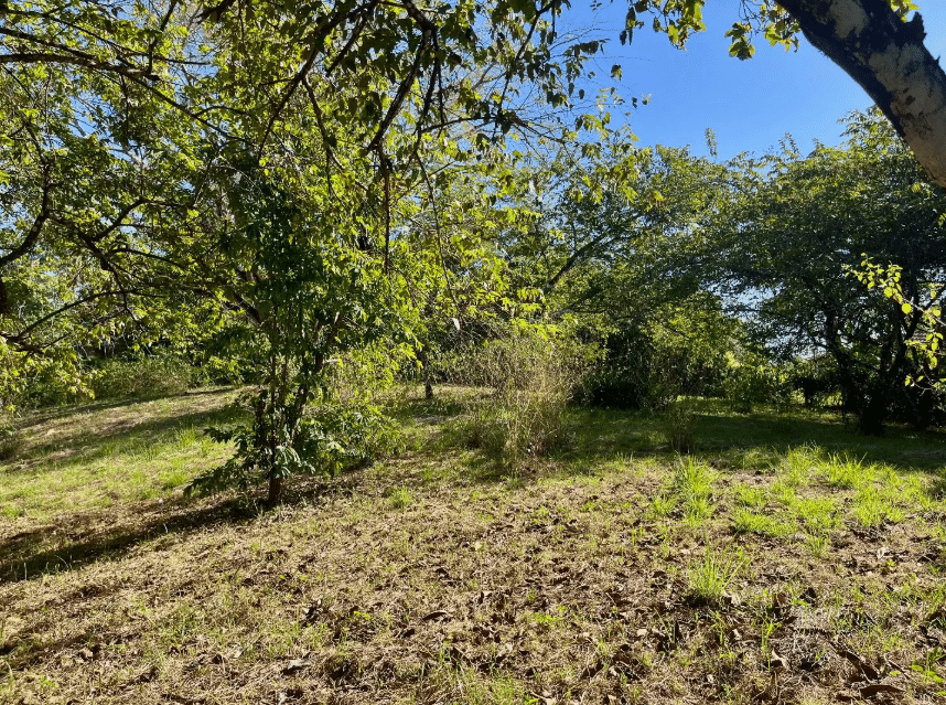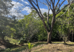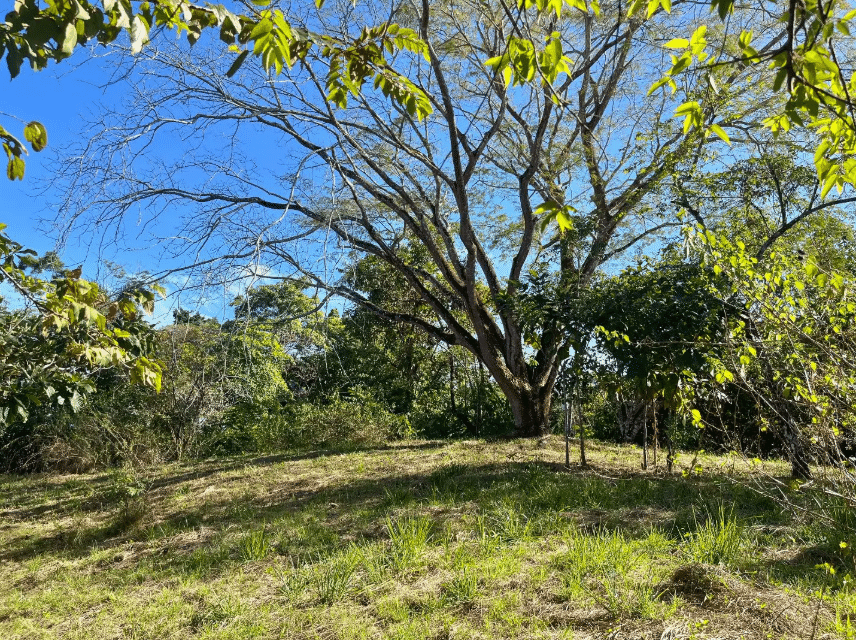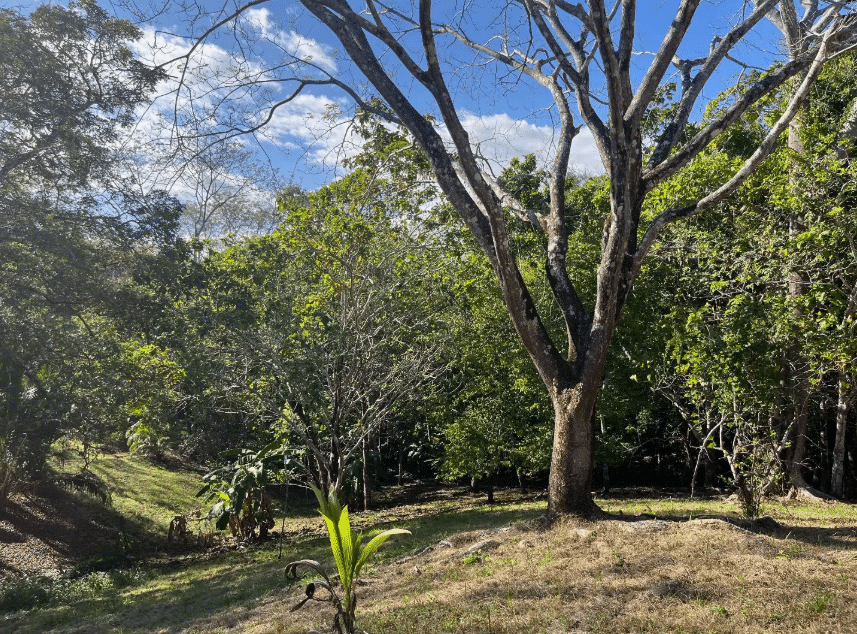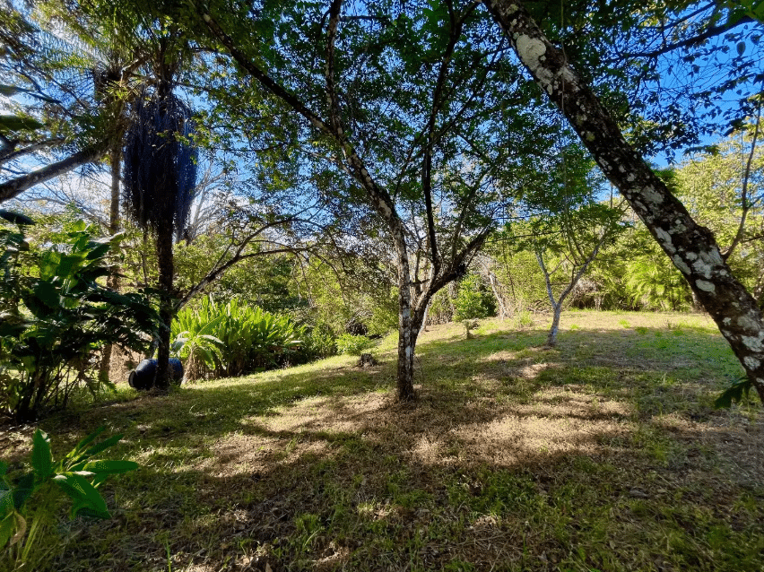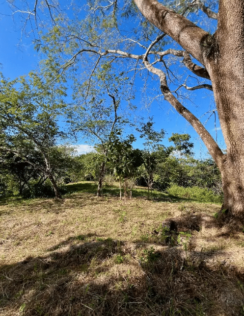 The land is predominantly flat with gentle slopes, offering favorable conditions for construction. Mature trees provide natural shade, and the property features abundant tropical vegetation, flowering plants, and established fruit trees including guanábana, star fruit, cashew, lemon, and grapefruit. A consistent fresh breeze flows through the property, and local wildlife enhances the sense of living immersed in nature. Partial ocean views can be enjoyed from certain areas through the surrounding greenery.